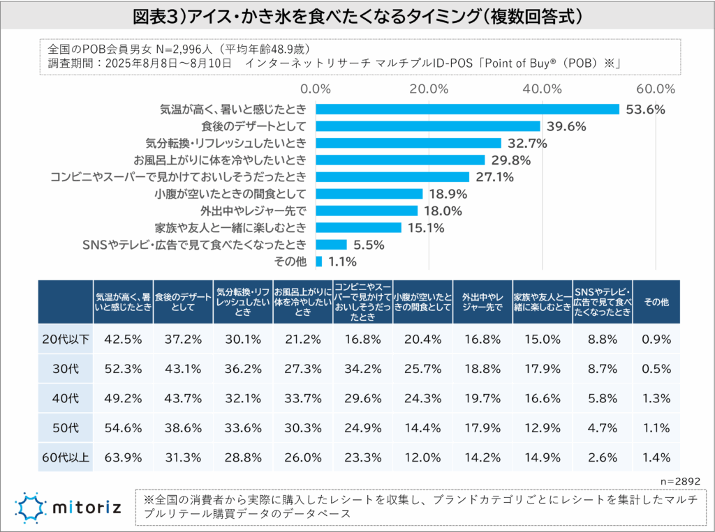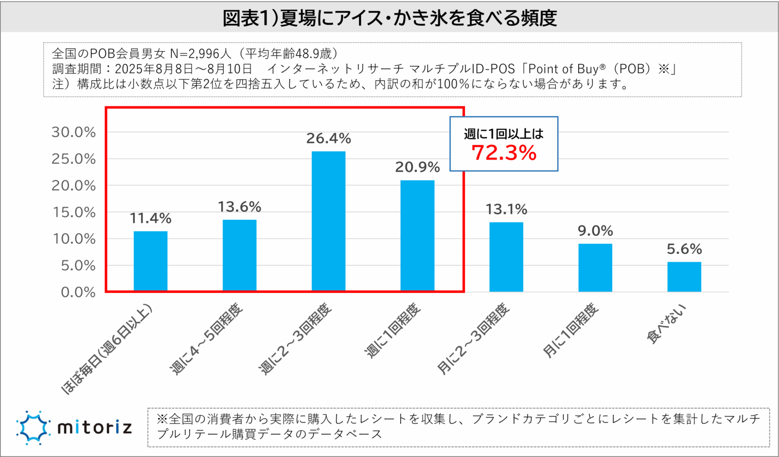 株式会社mitoriz(本社:東京都港区、代表取締役社長:原田光幸)は、消費者購買行動データサービス「Point of Buy®(以下、POB)」の会員2,996人を対象に「アイス・かき氷に関する調査」を実施しました。
